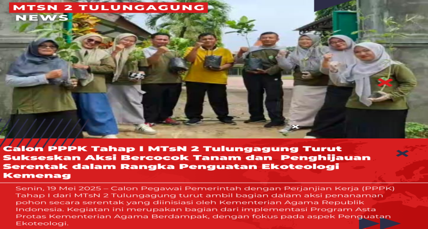 Senin, 19 Mei 2025 – Calon Pegawai Pemerintah dengan Perjanjian Kerja (PPPK) Tahap I dari MTsN 2 Tulungagung turut ambil bagian dalam aksi penanaman pohon secara serentak yang diinisiasi oleh Kementerian Agama Republik Indonesia. Kegiatan ini merupakan bagian dari implementasi Program Asta Protas Kementerian Agama Berdampak, dengan fokus pada aspek Penguatan Ekoteologi.