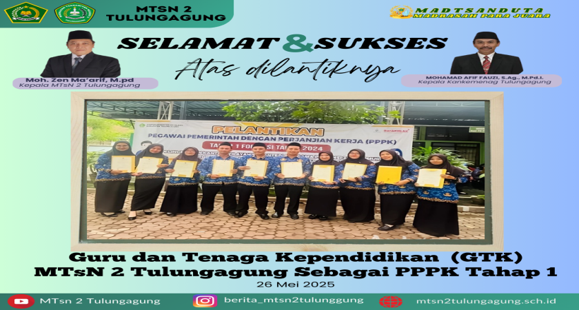 Selamat dan Sukses Atas dilantiknya 9 Guru dan Tenaga Kependidikan (GTK) MTsN 2 Tulungagung sebagai Pegawai Pemerintah dengan Perjanjian Kerja (PPPK) Tahap 1 Formasi Tahun 2024