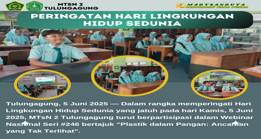 Tulungagung, 5 Juni 2025 — Dalam rangka memperingati Hari Lingkungan Hidup Sedunia yang jatuh pada hari Kamis, 5 Juni 2025, MTsN 2 Tulungagung turut berpartisipasi dalam Webinar Nasional Seri #246 bertajuk "Plastik dalam Pangan: Ancaman yang Tak Terlihat".