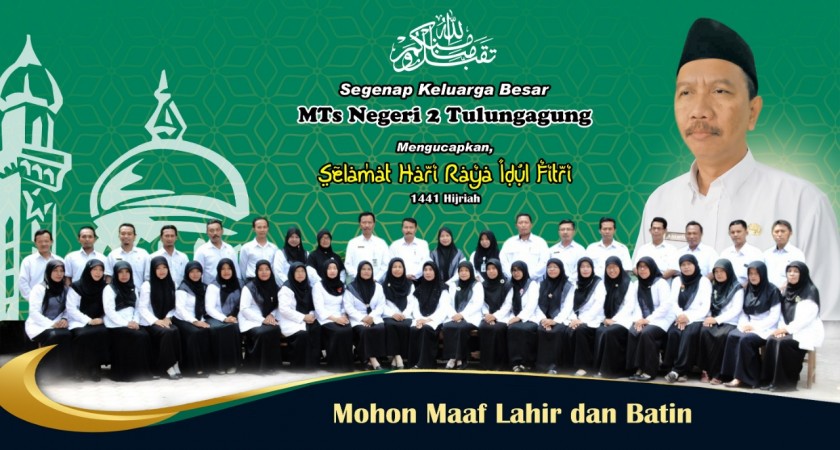Perayaan Idul Fitri tahun 2020 ini ada yang berbeda. Pasalnya dihadapkan dengan merebaknya pandemi virus Corona atau Covid-19. Sesuai anjuran pemerintah perayaan idul fitri dan silaturrohmi dilakukan dengan media online untuk itu kami keluarga besar MTsN 2 Tulungaung "mengucapkan selamat hari raya Idul Fitri 1441 H. Idun Mubarak Taqqobbalallahu minna wa minkum Minal Aaidin Wal Faizin mohon maaf lahir dan batin. Teriring doa semoga ibadah shaum dan beragam amal sholih kita diterima disisi Allah sebagai pemberat timbangan sholih di Yaumil Qiyamah" Amiin