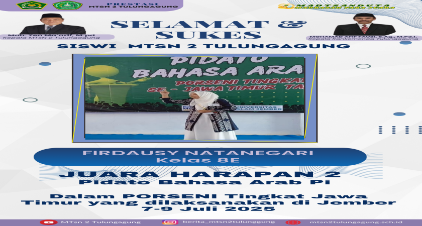 Tulungagung — Prestasi membanggakan kembali ditorehkan oleh siswi MTsN 2 Tulungagung. Firdausy Natanegari, siswi kelas 8E, berhasil meraih Juara Harapan 2 dalam cabang lomba Pidato Bahasa Arab Putri pada ajang PORSENI tingkat Jawa Timur yang diselenggarakan di Jember pada 7–9 Juli 2025