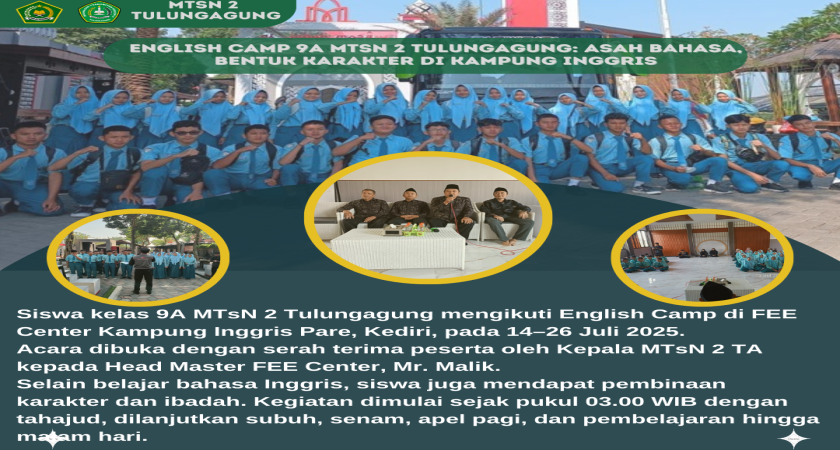 Siswa kelas 9A MTsN 2 Tulungagung mengikuti kegiatan English Camp di FEE Center Kampung Inggris, Pare, Kediri, pada tanggal 14 hingga 26 Juli 2025. Kegiatan ini diawali dengan acara serah terima peserta oleh Kepala MTsN 2 Tulungagung kepada Head Master FEE Center, Mr. Malik.
